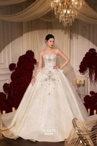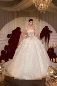 Tuy nhiên, theo kinh nghiệm thực tế từ Marie Bridal, không có một công thức cố định nào cho khái niệm “váy cưới sang”. Sự sang trọng không nằm ở chất liệu hay mức độ đính kết, mà nằm ở sự phù hợp với vóc dáng, phong cách và thần thái của cô dâu.
